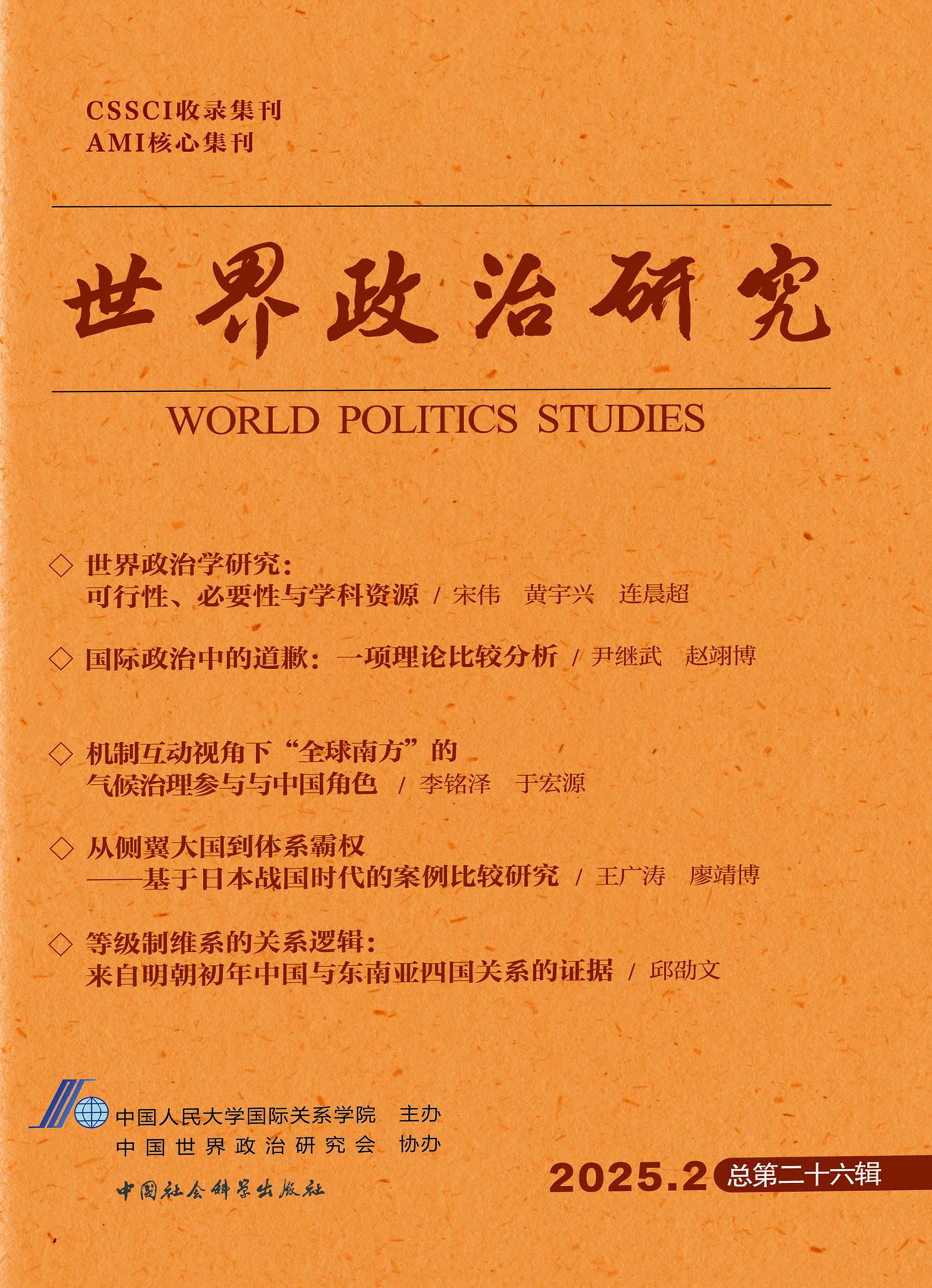 : 《世界政治研究》是由中国人民大学国际关系学院创办的学术出版物。创刊的宗旨是推广“大政治学”的概念,倡导以世界视野研究重大政治问题,促进国际政治与比较政治两大学科群的交流和整合,并推动区域国别研究与政治学理论的结合。 《世界政治研究》面向国内外公开发行,2018年将通过以书代刊的形式运营,并将适时过渡为正式期刊(季刊)。本刊将重点刊发国际政治、比较政治、国际政治经济学、比较政治经济学、全球治理、区域和国别政治等领域的优秀学术成果,鼓励思想创新和学术争鸣,提倡研究方法的多元性,尤其欢迎实证研究的稿件。 说明:该杂志未出现在最新新闻出版总署目录内,仅做历史信息展示,不提供任何服务。